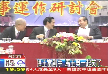中國(guó)臺(tái)灣網(wǎng)2月21日消息 綜合臺(tái)灣媒體報(bào)道,國(guó)民黨今(21)日下午召開(kāi)臺(tái)“立法行政部門(mén)議事運(yùn)作研討會(huì)”,藍(lán)營(yíng)“立委”關(guān)切2012“大選”馬英九的副手議題,認(rèn)為不論“馬吳”或“馬王”配,都應(yīng)盡速確定。部分“立委”甚至當(dāng)面直接向馬英九“逼宮”,表示很多藍(lán)軍支持者建議由王金平擔(dān)任馬英九競(jìng)選連任的副手;而坐在臺(tái)下的馬英九、王金平、吳敦義聽(tīng)后都尷尬的笑了起來(lái)。