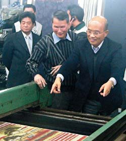 蘇貞昌(右)昨日參觀新北市印染廠,至于是否投入2012“大選”,他首度松口表示“正認真考慮中”。圖片來源:臺灣《聯合報》