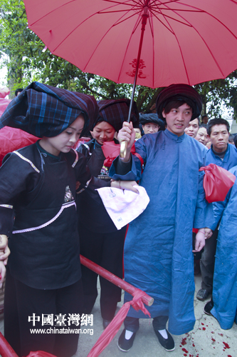 新郎打著紅傘迎接新娘下轎。(中國臺灣網 陳佳慧 攝)