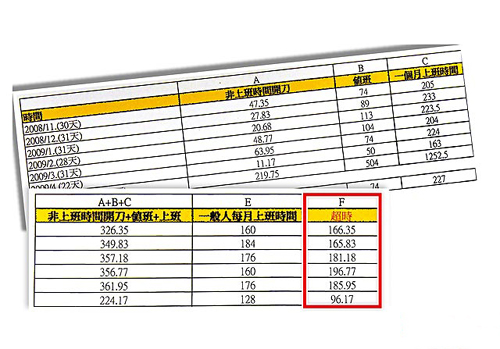蔡伯羌妻子整理丈夫病倒前半年上班時數,每月較一般人超時100多小時(紅框)。圖片來源:臺灣媒體