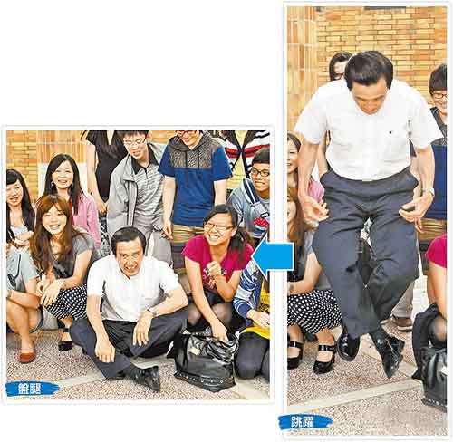 昨日,馬英九到臺中靜宜大學時心血來潮,在與同學合影時表演“立定、彈跳、坐地”(立定跳遠)。只見馬英九往上跳、騰空盤腿,接著“咚”地一屁股坐在地上,身邊大學生們看到61歲的馬英九動作依然靈活,不禁“哇”地驚呼起來。