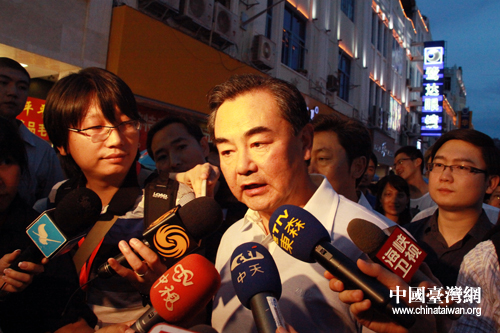 6月12日下午,正在廈門出席第三屆海峽論壇的國務院臺辦主任王毅參觀了在廈門市中山路舉行的臺灣特色廟會。圖為王毅接受兩岸媒體采訪。(中國臺灣網 王偉 攝)