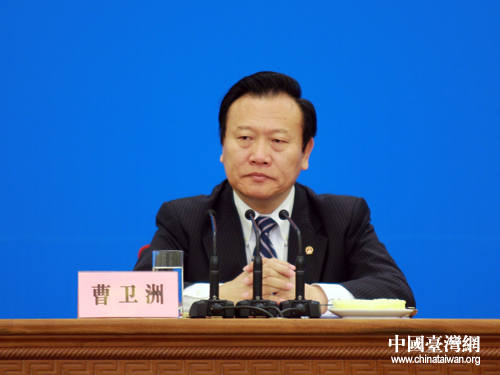 十一屆全國人大五次會議今天上午10時在人民大會堂三樓金色大廳舉行記者會。全國人大常委會副秘書長曹衛洲主持記者會。(中國臺灣網 王偉 攝)