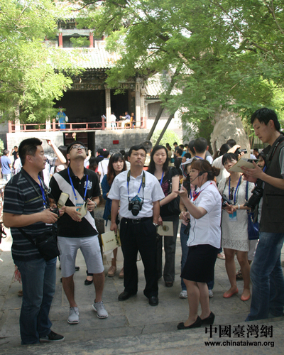 記者們在山陜會館認真聽取講解員介紹。(中國臺灣網 郭瑩瑩 攝)