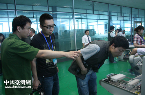 記者們在燎原光伏產業園生產車間近距離觀察其生產設備。(中國臺灣網 郭瑩瑩 攝)