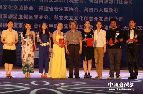 在第三屆海峽兩岸媽祖歌曲青年歌手大獎(jiǎng)賽頒獎(jiǎng)晚會(huì)上,嘉賓向獲獎(jiǎng)選手頒發(fā)獎(jiǎng)杯及獲獎(jiǎng)證書。(中國(guó)臺(tái)灣網(wǎng) 張潔 攝)