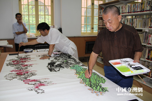 兩岸作家合作一副巨畫,寓意兩岸文化交流開花結果。(中國臺灣網 芮益芳 攝)