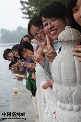 兩岸學子在什剎海畔合影留念。(中國臺灣網 孟雅詩 攝)