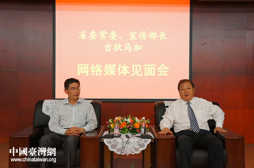 青海省常委、宣傳部長吉狄馬加(右)召開全國重點網絡媒體見面會。(中國臺灣網 羅旭婷 攝)
