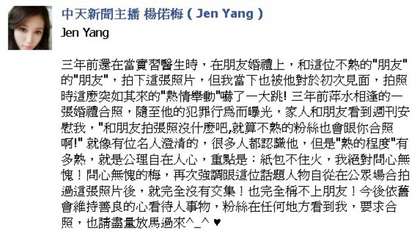 中國臺灣網8月16日消息 據臺灣媒體報道,昨天出刊的臺灣《壹周刊》中,出現臺灣富少李宗瑞和女主播的親密摟肩照,臺灣媒體新聞主播楊偌梅在臉書上澄清,該張照片是在3年前朋友婚禮上拍攝,當時是第一次和李宗瑞見面,2人只是萍水相逢,之后從來沒有交集,連朋友都稱不上。