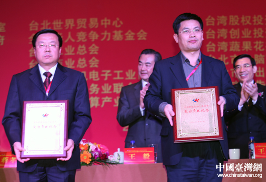 與會領(lǐng)導(dǎo)嘉賓向臺灣電機(jī)電子工業(yè)同業(yè)公會、北京通訊信息協(xié)會機(jī)構(gòu)頒發(fā)京臺科技論壇突出貢獻(xiàn)紀(jì)念牌。(中國臺灣網(wǎng) 王思羽 攝)