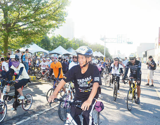 臺南市市長賴清德、議員李文正等人為活動鳴笛。賴清德說,市府正打造沿著嘉南大圳到烏山頭水庫的山海自行車道,全長45公里,將使臺南成為最佳單車運動城市。