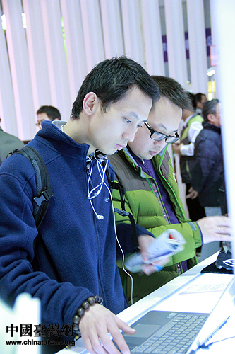 市民體驗臺灣精品館的超薄筆記本電腦。(中國臺灣網 楊麗 攝)
