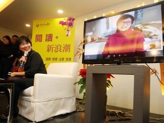 臺當局“文化部長”龍應臺(左前)邀請影星林青霞(圖右屏幕)擔任“文化大使”,推廣閱讀風氣,23日下午兩人視訊聯機,一同號召民眾加入閱讀行列。圖自臺媒