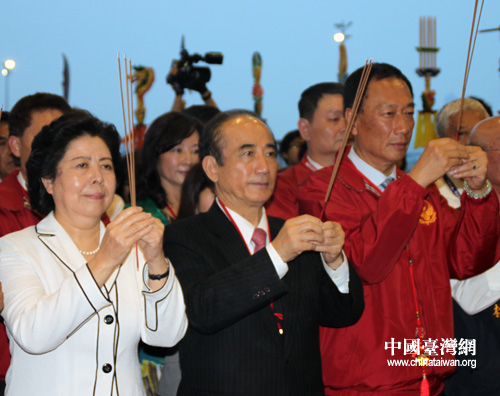 山西省委常委、宣傳部長(zhǎng)胡蘇平,臺(tái)灣立法機(jī)構(gòu)負(fù)責(zé)人王金平,臺(tái)灣鴻?萍技瘓F(tuán)董事長(zhǎng)郭臺(tái)銘拜祭關(guān)公祖廟圣像。(中國(guó)臺(tái)灣網(wǎng) 李典典 攝)