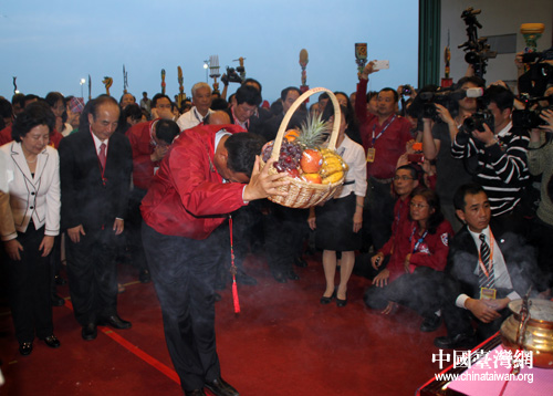 臺灣鴻海科技集團董事長郭臺銘敬獻果籃(中國臺灣網 李典典 攝)