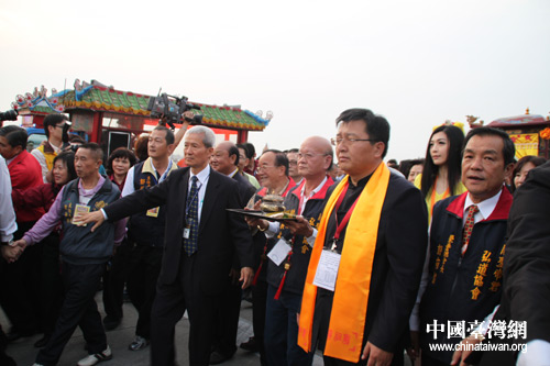 中華道教關圣帝君弘道協會總會長陳展松恭迎香爐(中國臺灣網 李典典 攝)
