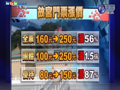 臺(tái)北故宮日前宣布票價(jià)即將漲價(jià),普通票自160元(新臺(tái)幣,下同)漲到250元,優(yōu)惠票從80元調(diào)漲到150元,漲幅8成。團(tuán)體票漲更兇,從100元漲到250元,更是漲了1.5倍。
