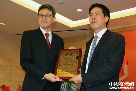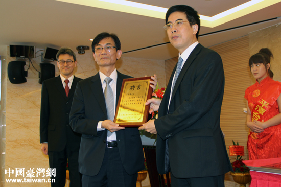 陳東榮為當選監事長的嚴世杰頒發當選證書。(中國臺灣網 王思羽 攝)