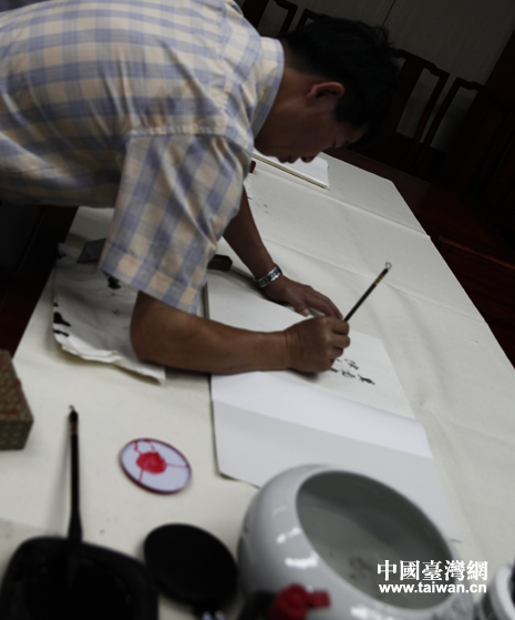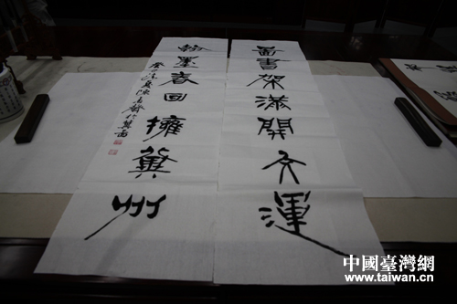 臺中市政府參事兼主任、勤益大學(xué)文創(chuàng)系助理教授更是在河北省圖書館揮毫潑墨,留下“圖書架滿開大運(yùn) 翰墨春回?fù)砑街荨保。ㄖ袊_灣網(wǎng) 高斯斯 攝)
