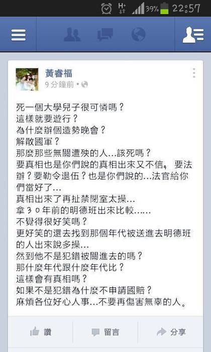 黃睿福po文表示“死一個大學兒子很可憐嗎?…要真相也是你們說的真相出來又不信,要法辦?要勒令退伍?也是你們說的…法官給你們當好了…真相出來了再扯禁閉室太操…拿30年前的明德班出來比較:不覺得很好笑嗎?更好笑的還去找到那個年代被送進去明德班的人出來說多操…然到他不是犯錯被關進去的嗎?那什么年代跟什么年代比?這樣會有真相嗎?如果不是犯錯為什么不申請‘國賠’?麻煩各位好心人事…不要再傷害無辜的人。”
