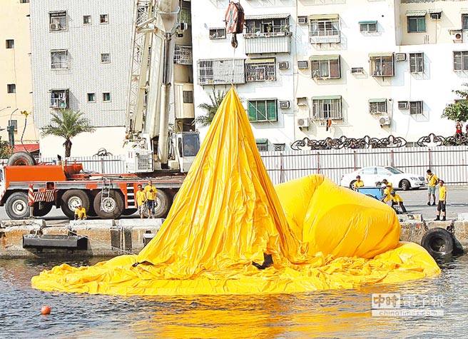 小黃鴨在海面上進(jìn)行充氣。(圖片來(lái)自臺(tái)媒)