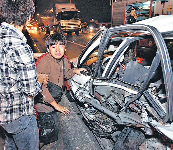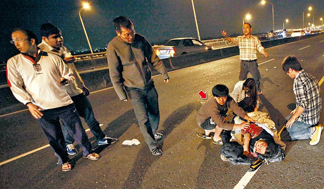 屏東駛往高雄的88快速道路昨日凌晨發生車禍,一名年長婦女被拋摔在大橋上,她的外孫(箭頭處)不知所措,路人見狀上前幫忙。來自臺媒