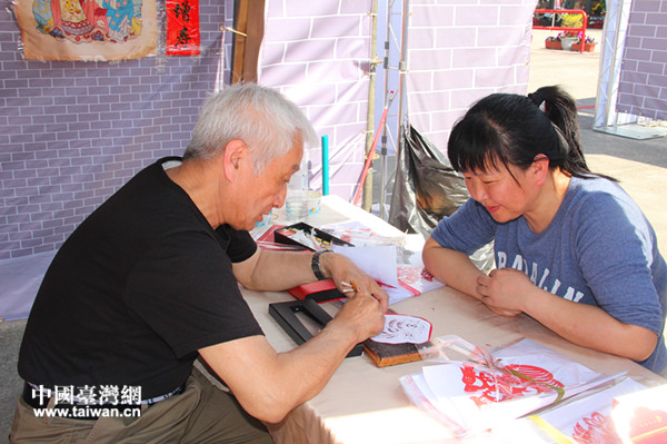 2月17日上午11時,距離撤展還有5個小時,京派剪紙圖樣已經不多,圖為靳鶴年老師根據臺灣客人的要求,現場制作剪紙。(中國臺灣網 李婷婷 攝)