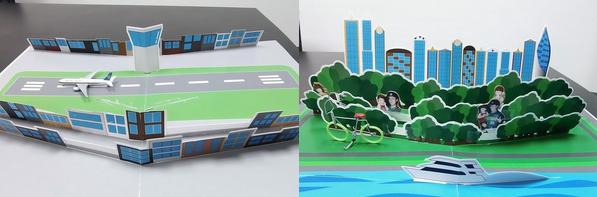 姚文智在辯論會上展示的立體書,展示松山機場翻轉成中央公園的模樣。(臺媒圖)