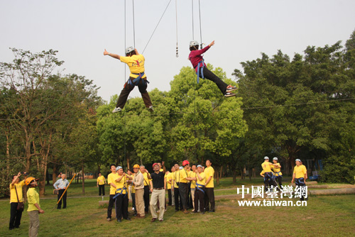 兩岸校長(zhǎng)在東莞臺(tái)商子弟學(xué)校生命力營(yíng)地體驗(yàn)團(tuán)隊(duì)互助協(xié)作。 (中國(guó)臺(tái)灣網(wǎng)發(fā) 王羽威攝)