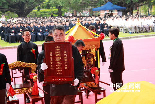 成年禮大典現(xiàn)場(chǎng),東莞臺(tái)商子弟學(xué)校董事長(zhǎng)葉宏燈親自護(hù)送中華民族始祖炎帝神位。 (中國(guó)臺(tái)灣網(wǎng)發(fā) 王羽威攝)