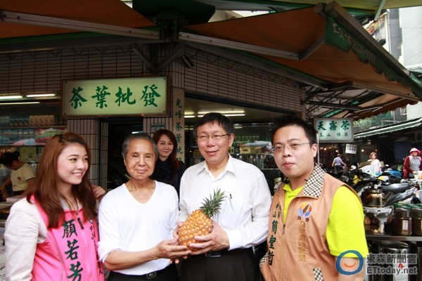 柯文哲13日上午赴臺北榮濱市場拜票,攤販送上菠蘿(旺來)表達支持。(圖片來自臺媒)