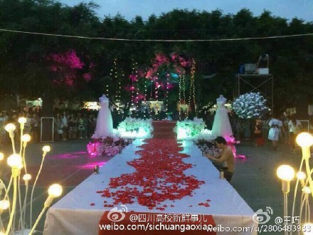 “鮮花、氣球、燈光、玫瑰花瓣,簡直是不能再夢幻了……”昨天晚上8點左右,在內(nèi)江師院東區(qū)籃球場上演了一幕極具浪漫和夢幻色彩的求婚儀式。一位畢業(yè)兩年的小伙在他和女友相戀的地方正式向女友伸出愛的橄欖枝,正式向女友求婚。最后女友在全程感動流淚的情況下答應(yīng)男友求婚。據(jù)悉,兩人接下來將根據(jù)計劃扯證結(jié)婚。