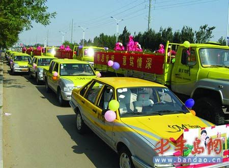 上午9時30分,記者在即墨城區新興路看到,由一輛輛轎車、大貨車及客車組成的迎親車隊浩浩蕩蕩,車身上掛著彩帶、大紅花及“百年好合”、“心心相印”等字樣,大貨車上還載著演奏隊,喜慶的音樂此起彼伏,引得路人紛紛駐足觀看。記者注意到,這些車大部分都是教練車,而駕駛教練車的是清一色的教練員。不久,一輛寶馬車帶領 9輛豪華車駛過來,據知情人介紹,駕駛寶馬車的新郎官是某駕校的校長。記者看到,10輛豪華車組成的車隊在前,再加上后面的教練車,整個車隊排出 300多米遠。