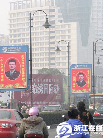 “聽說,廣告公司老板虧了六十萬,就想把英雄好好宣傳。”記者剛到金華時,曾經也是軍人的的哥葉錦良帶記者經過城南橋,指著顯示屏,特地告訴記者這個細節。之后浙江在線記者再次向王超忠印證時,他揮揮手,閉口不談。