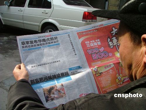 2月5日,陜西當地主要媒體刊登了陜西省林業廳因草率發布華南虎照片信息致謙信后,引起當地市民關注,不少市民購買當天報紙,查看有關報道。 中新社發 景龍 攝