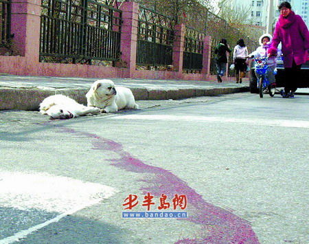 昨天下午1時許,記者在大堯一路與逍遙二路路口看到,一只白色的小狗躺在路邊上,一動不動,身下有一攤血跡。另一只白色的小京巴趴伏在遇難小狗的身邊,頭耷拉在地上,忽閃忽閃的大眼睛里溢出了淚水。
