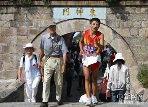 與往年相同,今年的登泰山比賽依舊分青年組、中年組、老年組三組。比賽從上午8:30同時(shí)開始,三組分別以泰山之巔——玉皇頂、南天門和中天門作為終點(diǎn)。與登山運(yùn)動(dòng)員們幾乎同一時(shí)間向山頂出發(fā)的記者,一路悠哉悠哉的坐車到中天門,再坐纜車到南天門,然后不緊不慢的朝著玉皇頂進(jìn)發(fā)。突然,一個(gè)很是熟悉的影子從身邊輕巧的掠過,又快速的向前沖去。原來,排在青年組第一名的山東小伙子居然已經(jīng)超過一路坐車走捷徑的記者,向著終點(diǎn)玉皇頂沖刺了。