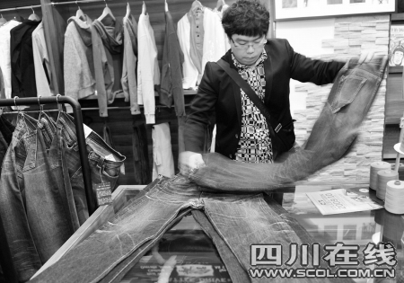 前日下午,“養牛人”之一的“豪豬”穿著一條已經“養”了兩年的牛仔褲從北京回到成都。作為成都“養牛”的先驅者,27歲的他已經“養牛”3年,現在手中有7條“牛”。說起自己的“牛”,“豪豬”立即搬出了4條牛仔褲。“這條是‘養了’3個月的,這條半年。”豪豬說,“接下來這條一年,最后就是兩年的。”豪豬拿起“養”了一年的褲子,褲子后袋部位上一個T字形十分明顯。這個是他在其他牛友的啟迪下,將一個小方盒裝在后袋內一個月磨出來的。“還能塞貓爪形狀的玩具,花紋酷酷的ZIPPO打火機,很Q吧?”