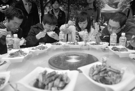 飯菜剛端上來,一桌人就開始狼吞虎咽。數分鐘后,他們又匆匆趕去下一家飯店,旋即只留下一桌殘羹冷炙……前日中午,在郫縣的5家飯店內,出現了這樣一群比拼飯量的人。原來,在九碗哥一炮打響后,十名網友報名參加成都全搜索網站組織的比賽,角逐“大胃王”的稱號。