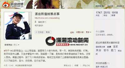 這樣一個來源于生活并記錄生活、很有趣的微博很快受到網友追捧。截至記者發稿前,關注“派出所”的網友已達2500多人,粉絲遍布全國。網友感嘆,“多年以后,你圍脖中的故事,就可以拍成一部很有生活氣息的連續劇了!