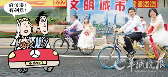 沒錯,這是一場別出心裁的單車婚禮。昨天上午,這對新人———新郎“尋找”、新娘“小驢佳佳”,在雨后初晴的廣州,如愿舉行了他們浪漫的“單車婚禮”。五六十名相識與不相識的“驢友”(網(wǎng)絡(luò)用語,泛指愛參加旅游、自助游的朋友),響應(yīng)了這對新人的號召,騎車前來助陣,成全了這支特別的“婚禮車隊”。