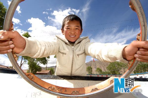 5月29日,玉樹藏族自治州孤兒板房學校學生、12歲的格求在學校操場上玩耍。 新華社記者 張宏祥 攝