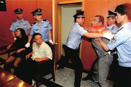 肇事司機(jī)張文明在法庭上情緒激動(dòng),他的妻子和大舅哥也分別被控制。本報(bào)通訊員李倩攝