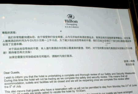 重慶市渝中區兩路口的希爾頓飯店,其大門緊閉謝客,希爾頓重慶營運總監彼得。魯格(Peter Rugg)的致歉信被置于酒店門前。