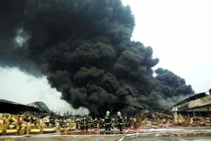 昨晨,位于房山區石樓鎮下坡子村的北京燕房華興倉儲有限公司庫房起火,大量化學品燃燒產生黑色濃煙。50余輛消防車約500名消防官兵參與救援,至下午2時許,大火基本被撲滅,事故未造成人員傷亡。安監局人員表示,倉庫中堆放的丙酮及苯酚均含毒,屬危險化學品。記者 吳江 攝