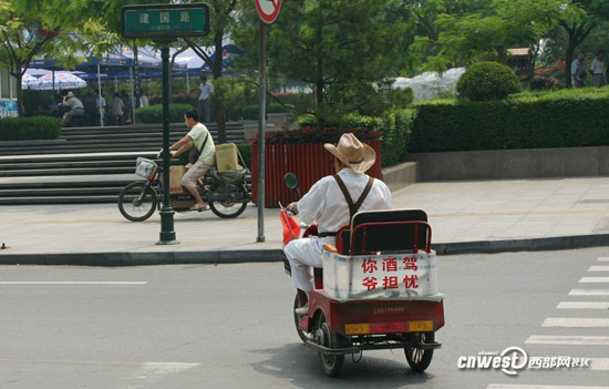 7月11日晚上9時許,西部網網友“拍得樂”將自己白天逛街時拍攝的5張照片傳到網上,照片的主角是一位胡子花白的老大爺,白襯衣、背帶褲、牛仔帽、墨鏡,老大爺十足的潮人打扮(如圖)。讓網友感興趣的是,老大爺騎的電動三輪車上貼著搞笑的標語——你酒駕,爺擔憂。