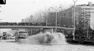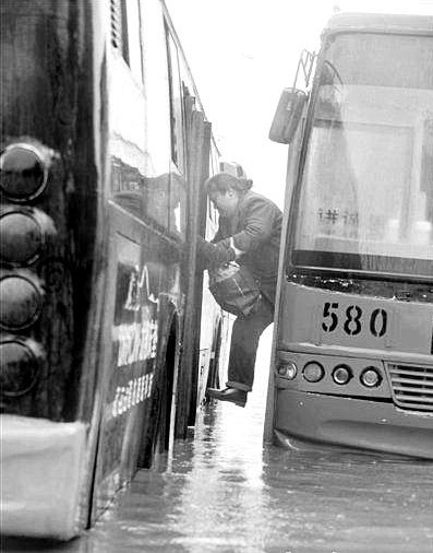 7月13日,網友復古魚在得意網發出了名為《在武漢不會開飛機的船長不是好司機》的帖子,其中附上了三張圖從不同角度反映了公交車司機“瘋狂”的一面,第一張圖中一輛公交車飛馳而過,前輪離地約30厘米,網友看后驚呼“果然飛起來了!”;第二張圖中公交車如同船一樣趟深水而過,大量水花濺離地面約2、3米;第三張更是“雷”人,一約六旬太婆被夾在兩公交車間正在痛苦的“跳車”,而她身下則是已沒過車輪胎的深水。