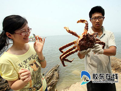 遠渡重洋來到煙臺的這幾只大螃蟹,不但體格超大,而且還有一些“特異功能”呢。矯先生告訴記者,其中那個名叫“霸王”的大螃蟹有6斤重,展開之后能有1米長,售價近2000元。“這么大的‘帝王蟹’在國內(nèi)來說不多見的。”矯先生說。