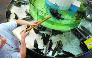 28日,北京日?qǐng)?bào)六版以《活魚(yú)“值班”死魚(yú)下鍋》為題曝光了“九頭鳥(niǎo)”世紀(jì)金源店顧客所點(diǎn)活魚(yú)被死魚(yú)掉包的情況,并在隨后對(duì)這一現(xiàn)象進(jìn)行了追蹤調(diào)查。記者發(fā)現(xiàn),經(jīng)曝光后九頭鳥(niǎo)的“值班魚(yú)”已經(jīng)下崗,而其他不少商家依然在沿用活魚(yú)換死魚(yú)的伎倆。“掉包計(jì)”儼然成了一些見(jiàn)利忘義飯館賣魚(yú)的潛規(guī)則。